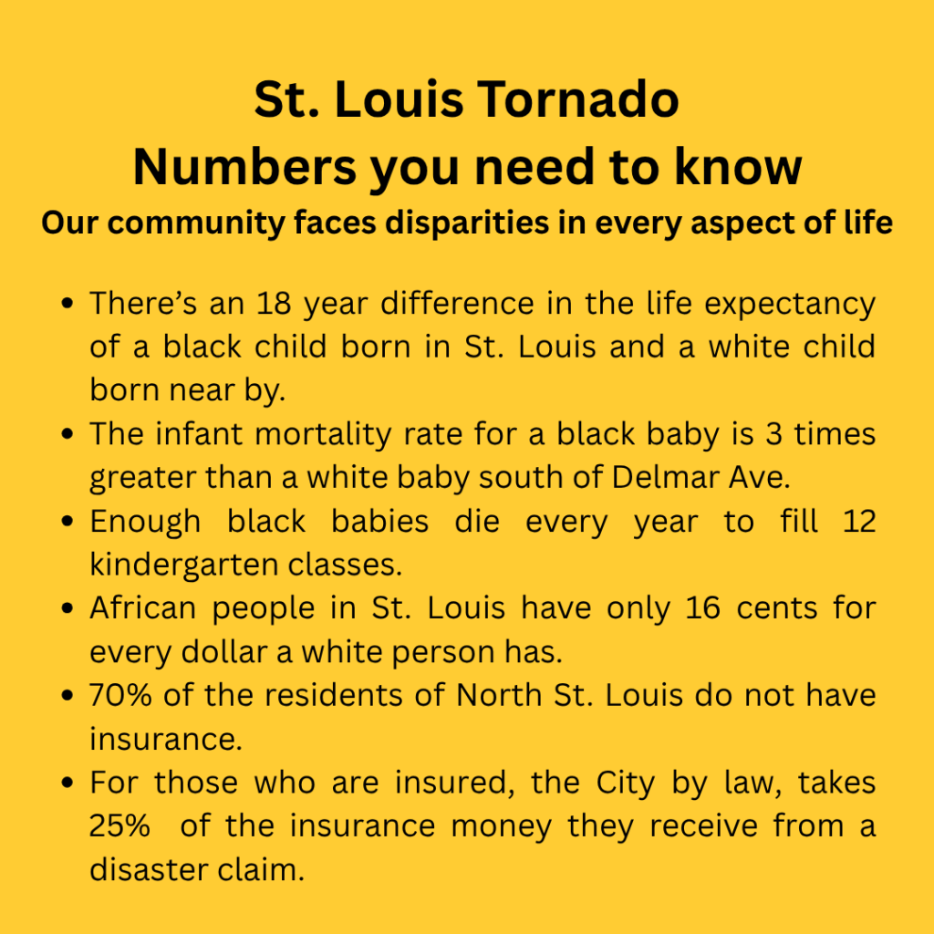 On the afternoon of May 16, 2025 a devastating EF3 tornado tore through North St. Louis, leaving in its wake unimaginable destruction unexpected by residents. Entire corridors of our city were ravaged - roofs torn off, walls collapsed, massive trees downed onto cars and homes, and power lines toppled. Over 100,000 residents were left without power for over a week. Thousands of people, 70 percent of whom do not have insurance, were displaced with only meager resources from the institutions that ought to serve them.